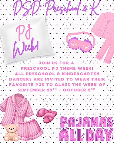 Preschool and kindergarten dancers, get ready for a cozy week of fun! Wear your favorite pajamas to class and join us as we celebrate PJ Theme week with lots of smiles and dancing.