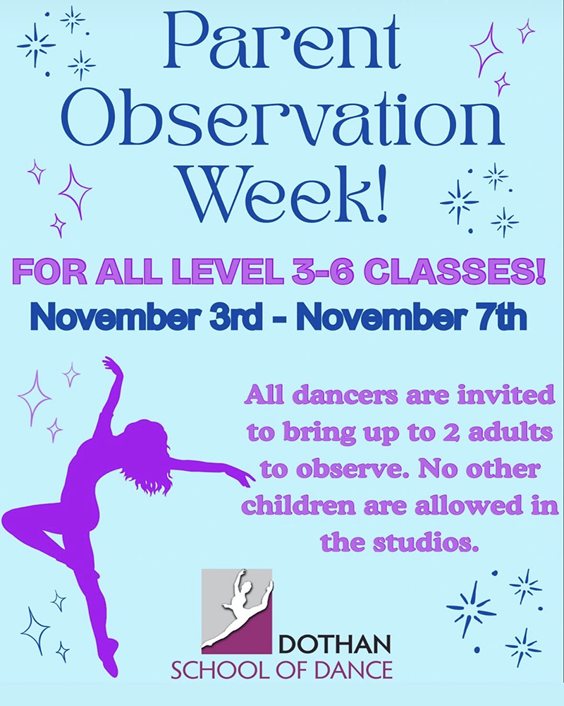 We’re excited to welcome families into the studio this year for special observation weeks! Each dancer’s level has a dedicated week, so mark your calendars! Each dancer may bring up to 2 adult guests. For the dancers’ focus, no extra children will be allowed…